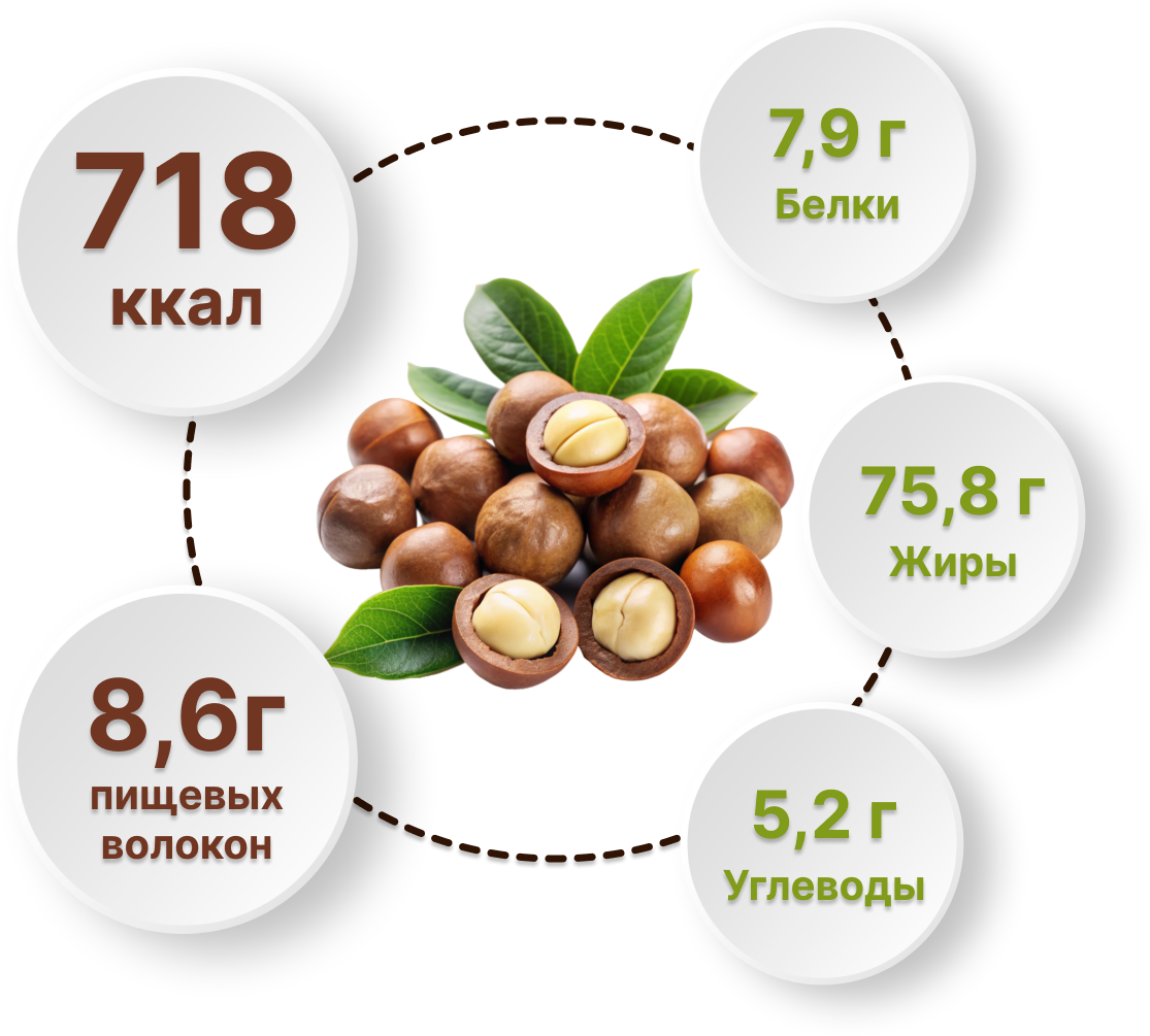 ПИЩЕВАЯ ЦЕННОСТЬ ОРЕХА МАКАДАМИЯ В 100 гр.